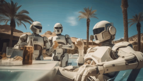 Midjourney Prompt: party of robots enjoying their day off by the pool, sunny, drinking cocktails, blue sky, white clouds, palm trees, landscape shot, Captured with a mirrorless camera, using a 175mm, ultra realistic, fine details --ar 16:9 --s 250