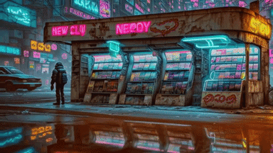 Newsstand on a futuristic cyberpunk city street full of neon and grime